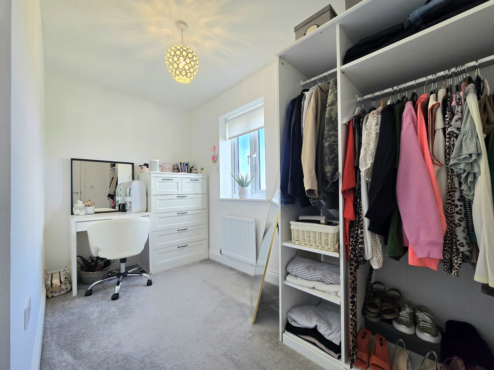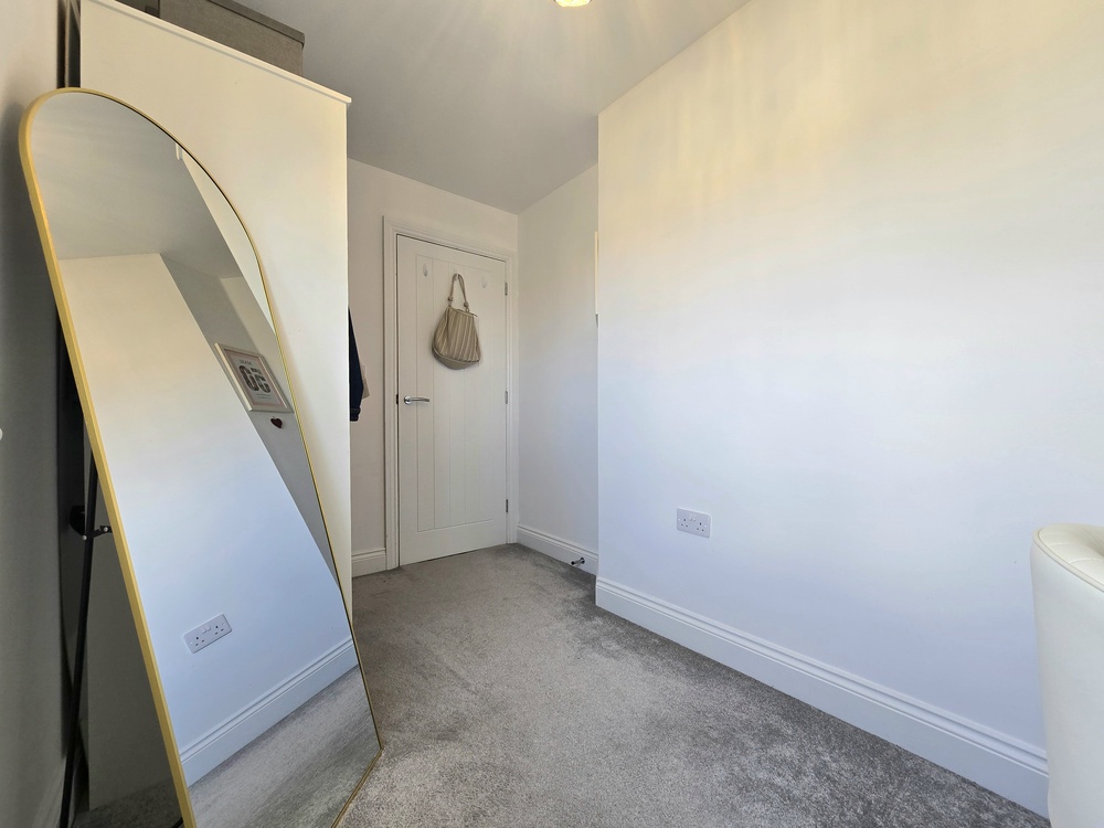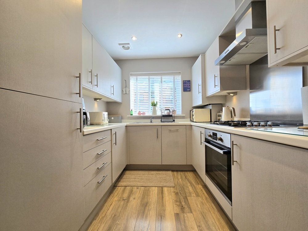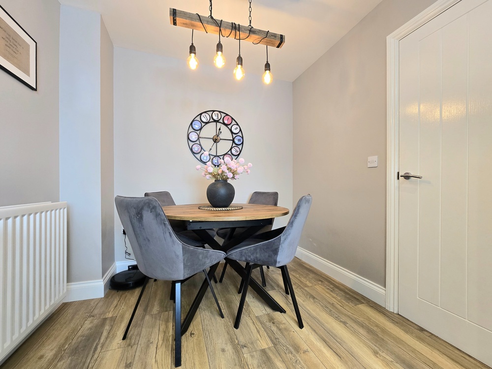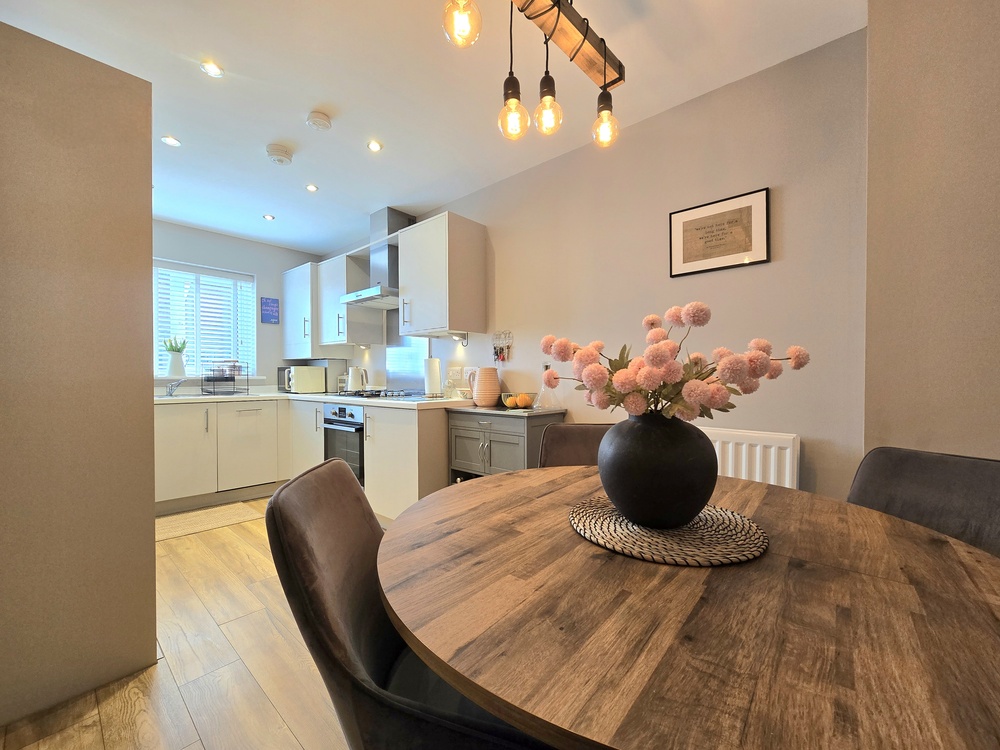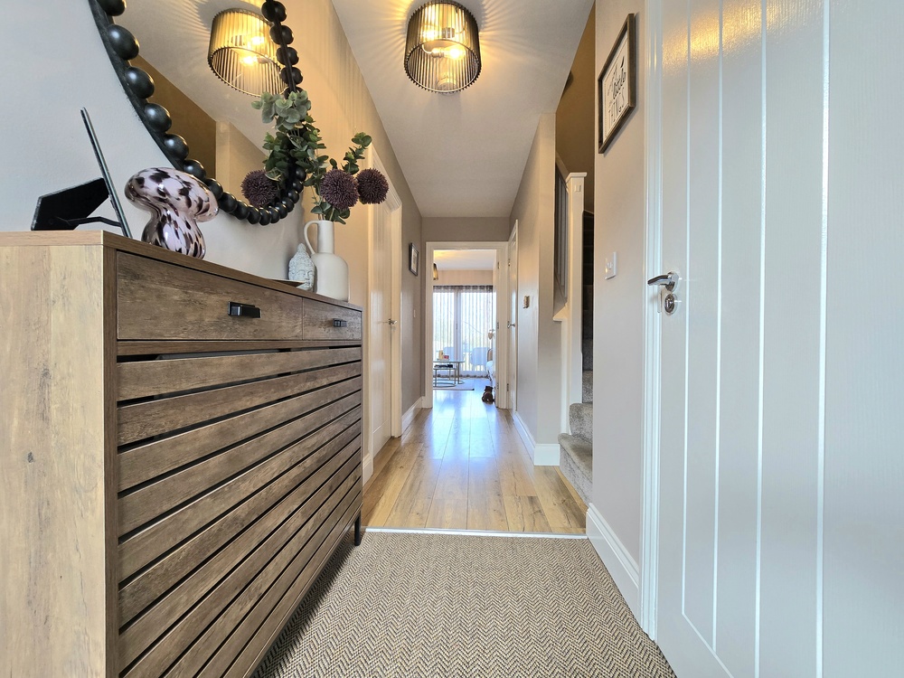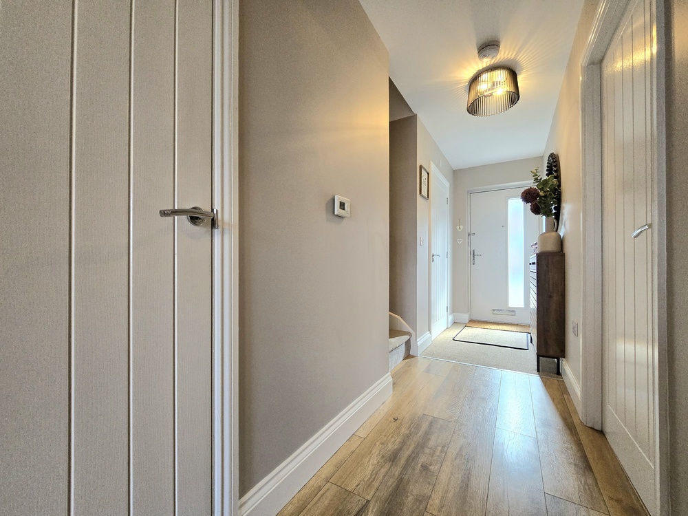 The welcoming entrance hallway leads to a convenient downstairs WC/washroom and a contemporary kitchen, complete with integrated appliances and a built-in washing machine plus a dining area to the front of the house. While to the rear, a spacious living room features doors that open out onto the garden—perfect for both relaxing and entertaining.
