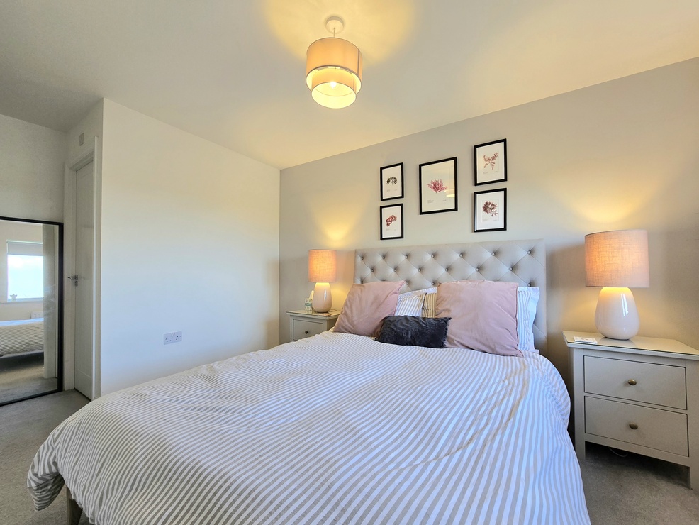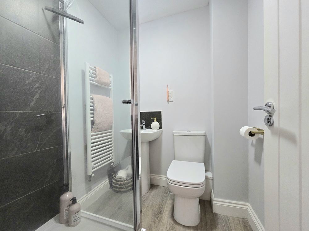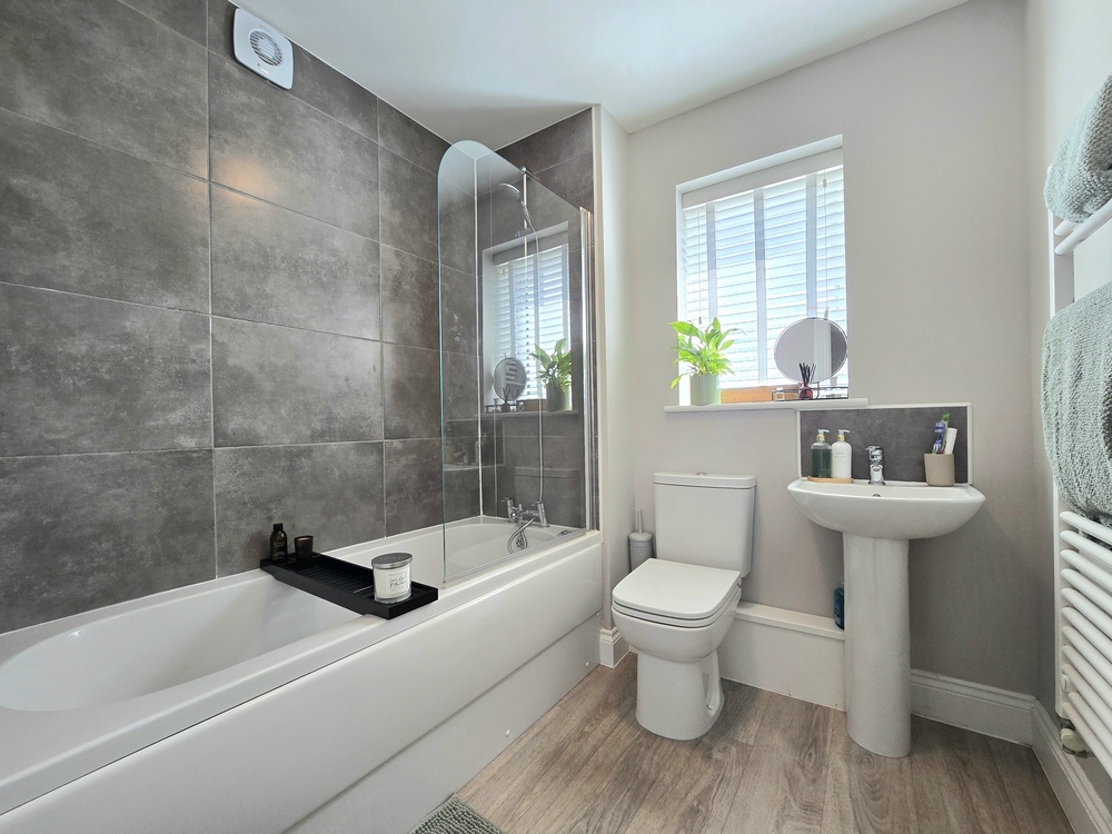 Upstairs, the property offers three well-proportioned bedrooms, including a main bedroom with its own en-suite shower room. A modern family bathroom with a shower over the bath serves the remaining bedrooms. The home also benefits from ample storage space throughout.